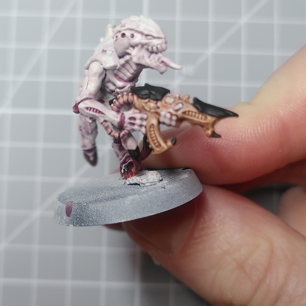 Start by painting the internal flesh (tubes connected to the weapons) with Carroburg Crimson . Highlight the interal flesh with some Kislev Flesh and do some doting on the internal flesh with some Pallid Wych Flesh